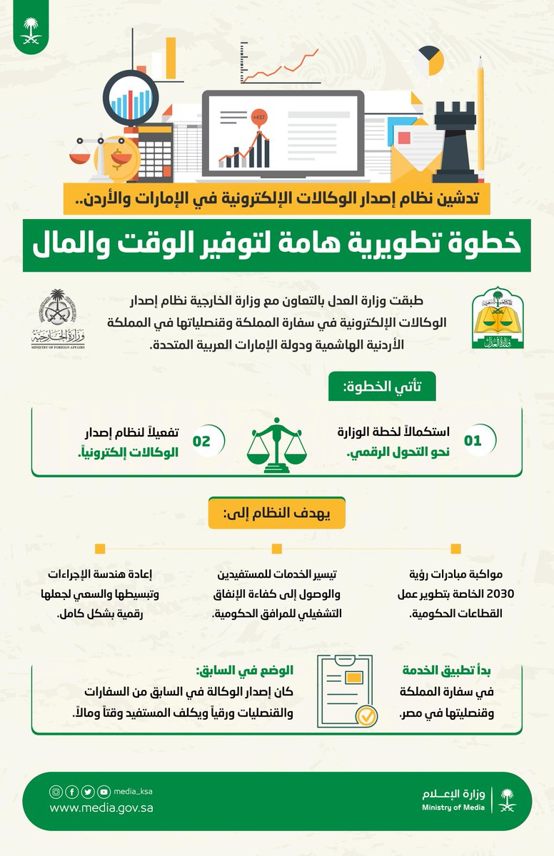 وزارة الإعلام A Twitter إنفوجرافيك وزارة العدل تدشن نظام إصدار الوكالات الإلكترونية في الإمارات والأردن